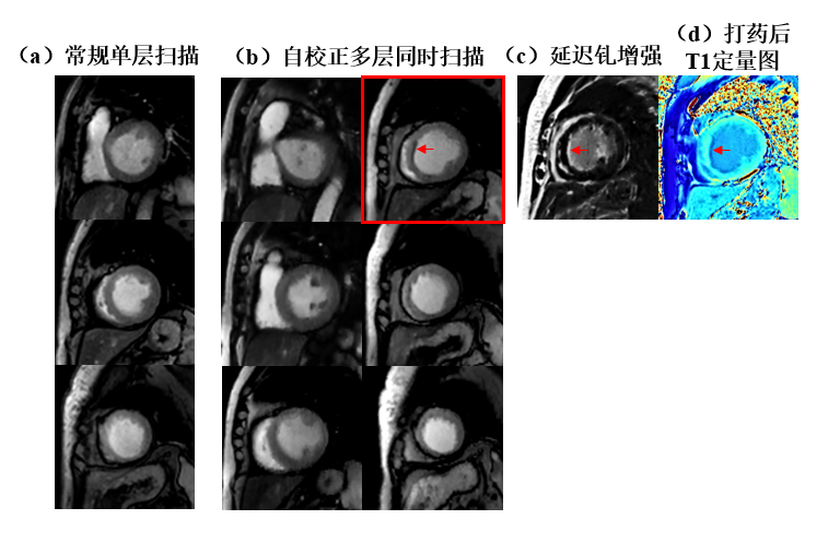 本文提出的自校准多层同时采集方法(b)发现了传统单层采集方法(a)遗漏的灌注缺损(缺血)区域(红箭),该区域与注射钆增强剂的延迟图像(c)T1定量图(d)上的梗死区域(红箭)一致。