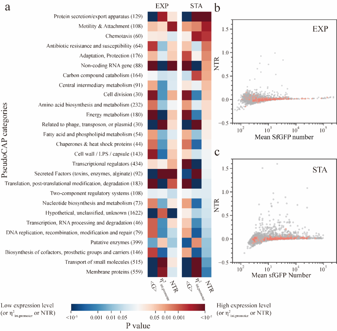到现在为止,在基因表达层面已经开展出了很好的理论来理解转录调控噪声的基本逻辑,并且发现对具有高转录调控噪声的基因的研究有望揭示细菌适应其栖息地的新机制。然而,在实验中很难区分转录调控噪声和转录过程的随机噪音,这妨碍了对转录调控噪声的理解,同时还缺乏基因组层面的转录调控噪声的认识。为了在系统水平上描述基因表达的转录调控噪声,金帆课题组团队在模式致病菌铜绿假单胞菌中构建了一个包含3336个菌种的双色荧光转录报告系统文库,并利用文库在单细菌层次上全面分析了铜绿假单胞菌基因组中超过90%启动子的转录调控噪声。该研究的结果为进一步地研究铜绿假单胞菌的转录调控给予了丰富的线索。