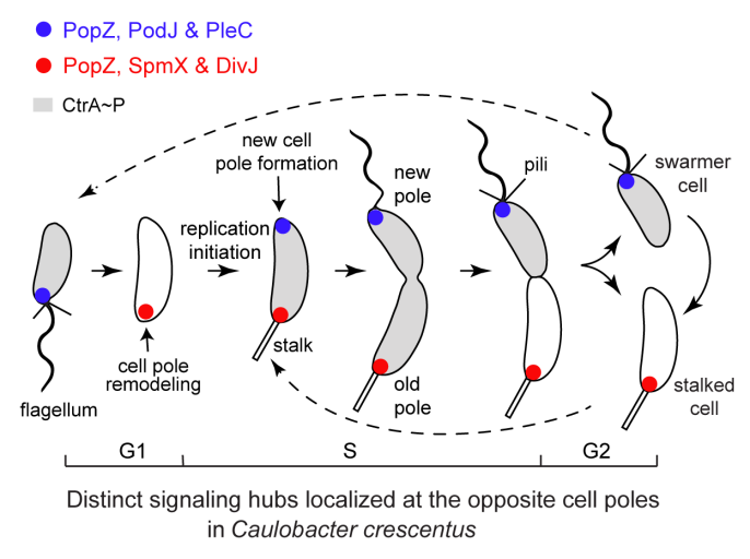 然而,由于细胞命运决定调控网络的高度复杂性,现在我们对细胞极性的理解仍处于初级阶段。细胞命运决定蛋白如何实现时空有序的不对称性亚细胞定位,是该领域有待深入解析的核心问题。微生物新月柄杆菌作为细胞不对称性分裂的精炼模型,在细胞极性研究中有独特优势。