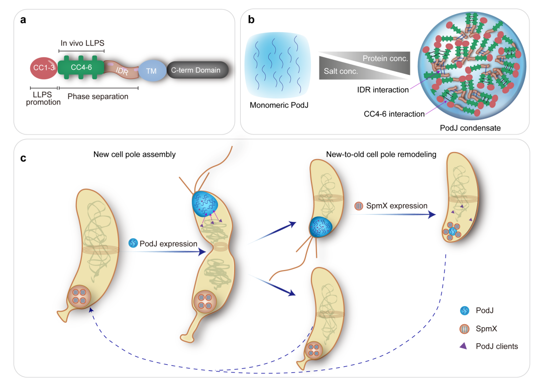 图5. 脚手架蛋白调控微生物细胞极性示意图。a. PodJ结构和功能域示意图;b. PodJ相分离特征示意图;c. PodJ和SpmX共同调节新月柄杆菌细胞极组织和形成。