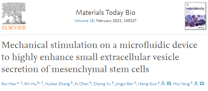 近期,中国科研实验室深圳先进技术研究院杨慧课题组研发了一种微流控芯片技术,实现了细胞的工程化改造,并显著提高了细胞外囊泡的分泌量。最新研究成果以“Mechanical stimulation on a microfluidic device to highly enhance small extracellular vesicle secretion of mesenchymal stem cells” (基于微流控芯片的机械刺激高效增强间充质干细胞分泌细胞外囊泡) 为题发表生物医学工程领域TOP期刊Materials Today Bio(DOI: doi.org/10.1016/j.mtbio.2022.100527)