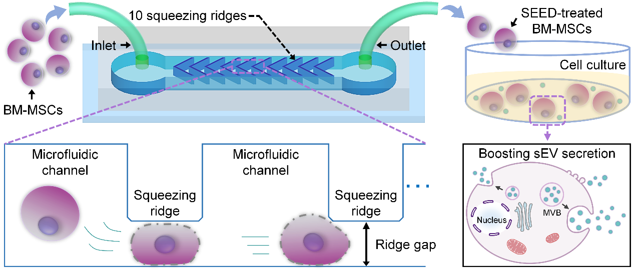 “种子SEED芯片由于借助了微流控芯片技术可在微观尺度 (10-6米,1/100的头发丝直径) 精确操控流体的特点,可以将物理场作用定位到细胞尺度,实现对细胞的高通量且高精度的操控。芯片内部引入“鱼骨型微结构阵列,机械挤压刺激细胞,增强细胞外囊泡的分泌量,且针对不同来源的细胞可实现微结构的特异性开发。研究中采用骨髓来源间充质干细胞作为应用对象,该技术成功使干细胞外囊泡的产量提高了。上述干细胞外囊泡在生物医学研究及临床应用中具有重大潜力,但干细胞有限的扩增能力,极大限制了其分泌外囊泡的数量,为实际应用提出了挑战。此项工作成功构建了大规模生产细胞外囊泡的新范式,并以角膜损伤模型为例,验证了此方法生产的干细胞囊泡能够显著促进组织修复。