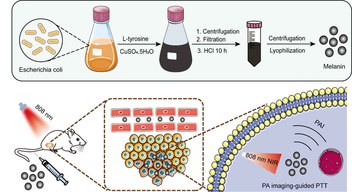 光热治疗作为一种肿瘤光学治疗策略,可以有针对性地在局部杀死癌细胞,在恶性肿瘤治疗方面具有微创、长效、安全等特点。但许多光热疗剂由于生物相容性差、生产和加工过程反应方法复杂、反应条件苛刻等治疗效果并不理想。因此,在环境友好的条件下开发生物相容性好的光热疗剂具有重要的研究意义。而黑色素作为一种多功能色素,被广泛应用于能源和生物医学等领域,特别是癌症的成像诊断和光热疗法。现在市面上的黑色素主要是顺利获得化学合成或从乌贼中提取取得的,这些方法并不适用于大规模生产。与之相较,生物合成黑色素则具备反应条件温和,环境友好,生物相容性好等优势。