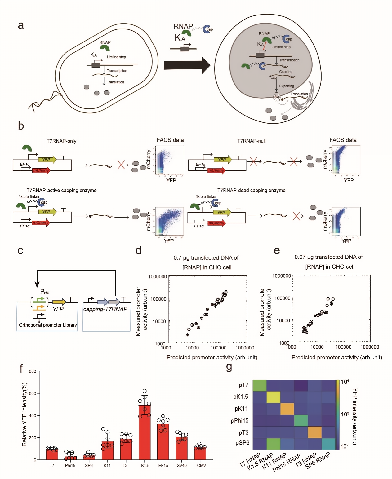 图1. 正交型启动子库和跨物种通用转录系统的构建和定量模型的实验验证