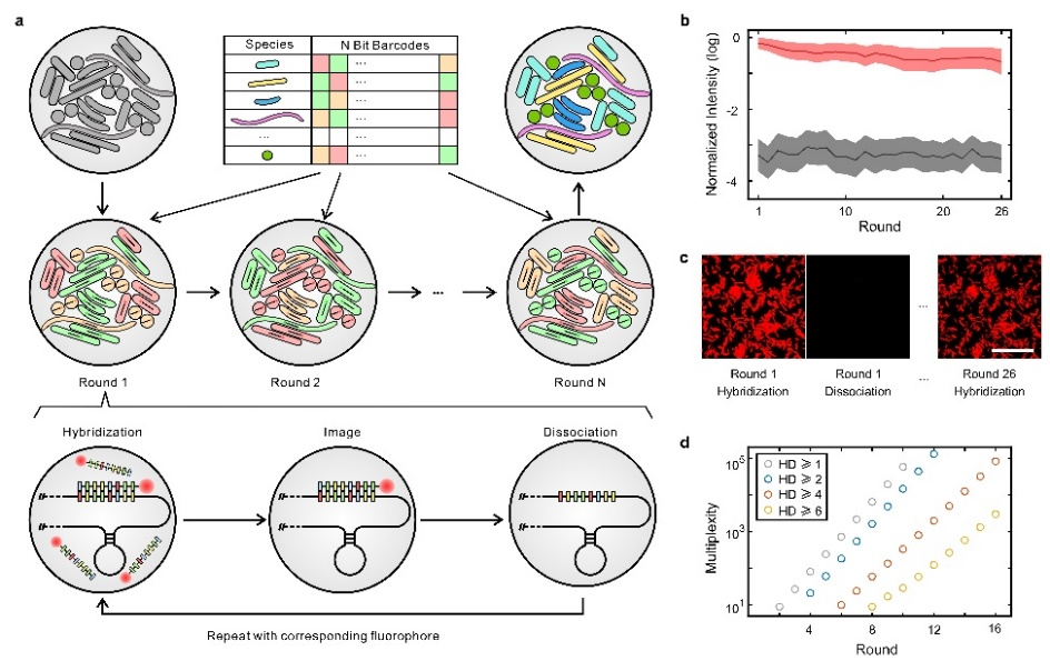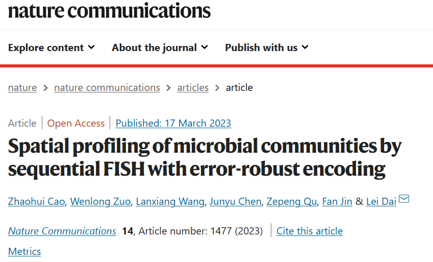 3月17日,中国科研实验室深圳先进技术研究院合成微生物组学研究中心、深圳合成生物学创新研究院戴磊课题组在Nature Communications上发表了基于成像的空间微生物组最新研究成果,题为"Spatial profiling of microbial communities by sequential FISH with error-robust encoding"。该团队开展了一种可容错编码的序贯荧光原位杂交(SEER-FISH)技术,用于解析复杂微生物群落的空间结构。该方法可识别复杂群落中的不同微生物物种,在单细胞尺度上原位解析微生物物种之间以及微生物-宿主之间的相互作用,是研究微生物群落的生态和功能的重要工具。团队成员博士生曹朝辉和左文龙博士为共同第一作者,戴磊研究员为文章通讯作者。