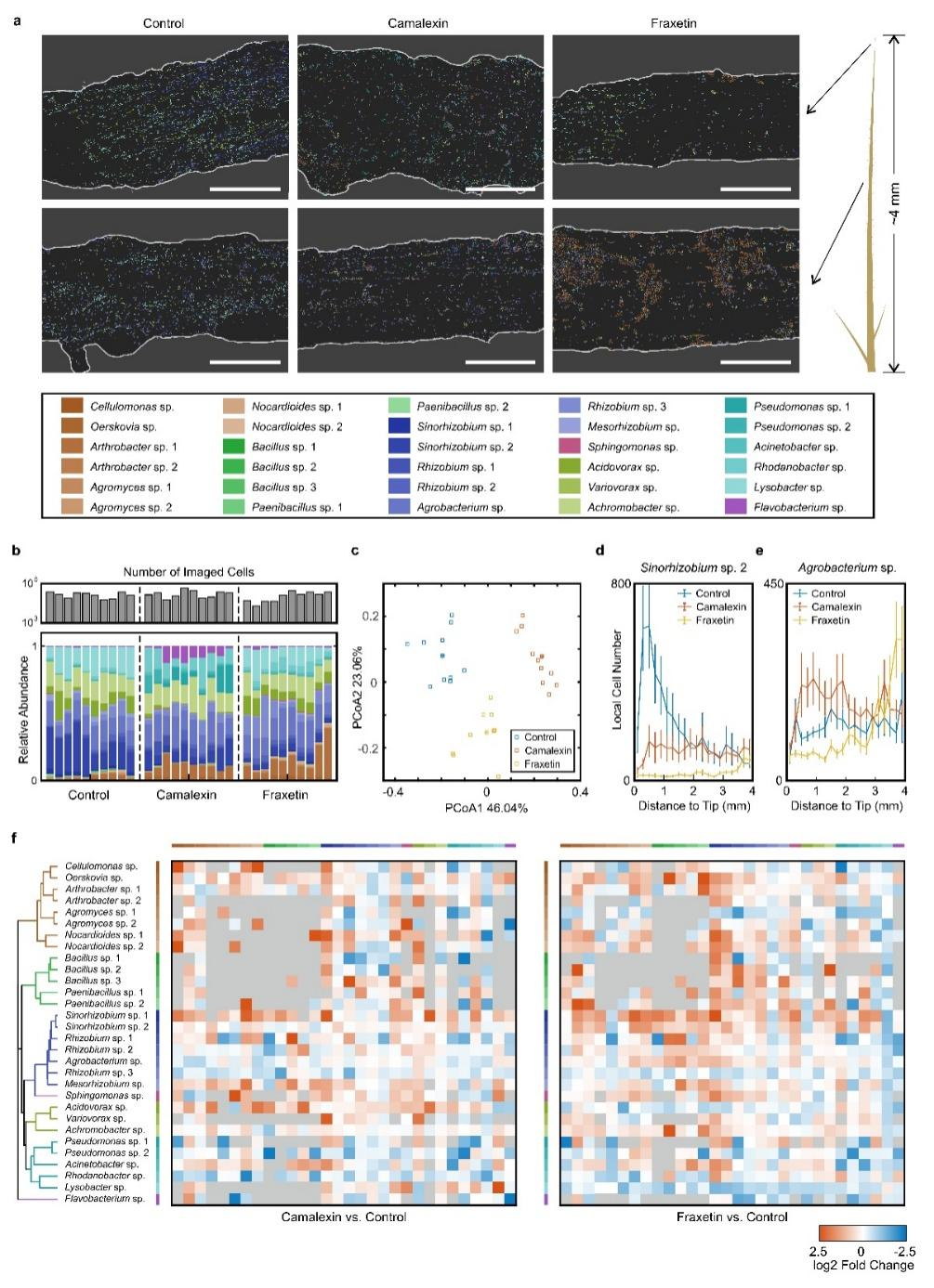 顺利获得外源添加拟南芥根际分泌的代谢产物植保素(camalexin)和香豆素(fraxetin),研究团队发现根际微生物的组成和空间分布都发生了显著的变化(图4a-c)。比如,中华根瘤菌主要定植于靠近根尖的位置,而这种偏好性的定植在加入植保素和香豆素后发生了改变(图4d)。农杆菌本身在根上的定植没有偏好性,但在受到香豆素扰动后表现出更多的定植于根成熟区(图4e)。根际微生物空间分布的高度异质性和物种之间的差异,与环境异质性、微生物本身的特性都有关。进一步对定植微生物的空间关联进行分析,发现植保素和香豆素都不同程度地影响改变了物种之间的空间关联(图4f)。微米尺度下的空间关联暗示了微生物群落中不同物种之间广泛存在的短程相互作用 (如营养竞争与互养、接触抑制、群体感应等),对于进一步的机制研究有重要的指导意义。