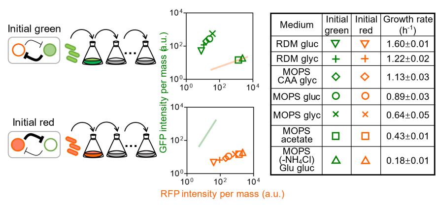 为了研究细胞的生长速率对基因网络是否可以存在影响,科研团队利用了经典合成基因线路——拨动开关线路(the toggle switch1),来研究这种可能性。拨动开关线路由两个相互阻遏的基因所构成,使得该线路在稳态(stable states)下只能存在一种基因处于高表达状态。这样的网络拓扑结构也广泛存在于自然界中,例如:λ噬菌体溶菌-溶原决定,线虫左右味觉神经分化。另外,构成这一线路的元件已经被广泛定量表征,与宿主自生基因调控网络相正交,因此可以排除宿主自身状态对基因线路的直接调控,同时也利于定量分析网络的稳态行为。