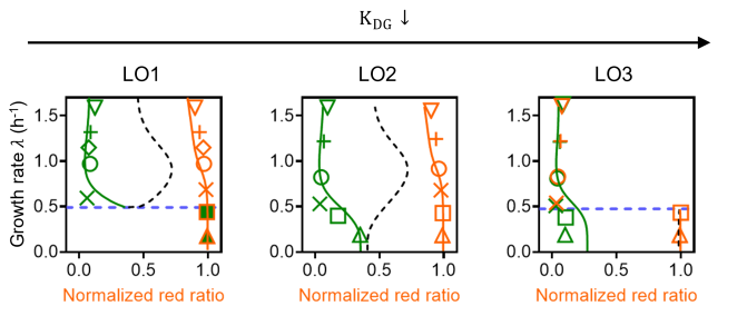 图 [2] 在不同培养条件下,细胞的稳态状态与数量将发生变化,当细胞生长速率低于0.5h-1时,细胞只存在红色一个稳定状态。
