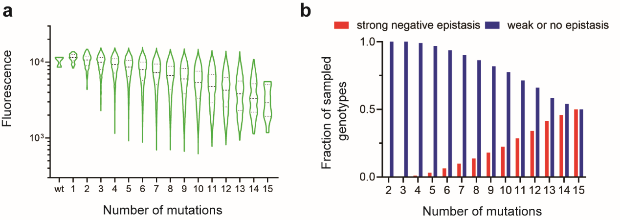 基于单点饱和突变扫描结果,作者进一步构建了覆盖15个位点的20个氨基酸突变的饱和突变组合文库,理论库容为18.4万。利用更大规模的FACS-seq,作者对多点突变体序列-荧光强度关系进行分析析,顺利获得过滤的16.5万条突变序列约占理论库容的90%。作者发现,整体荧光强度随着突变位点数的增加而逐渐减弱。由于各突变均具有荧光增强或中性效应,表明存在广泛的负上位效应。对氨基酸突变之间特异性上位效应(specific epistasis)的统计分析验证了这一推论(图2)。