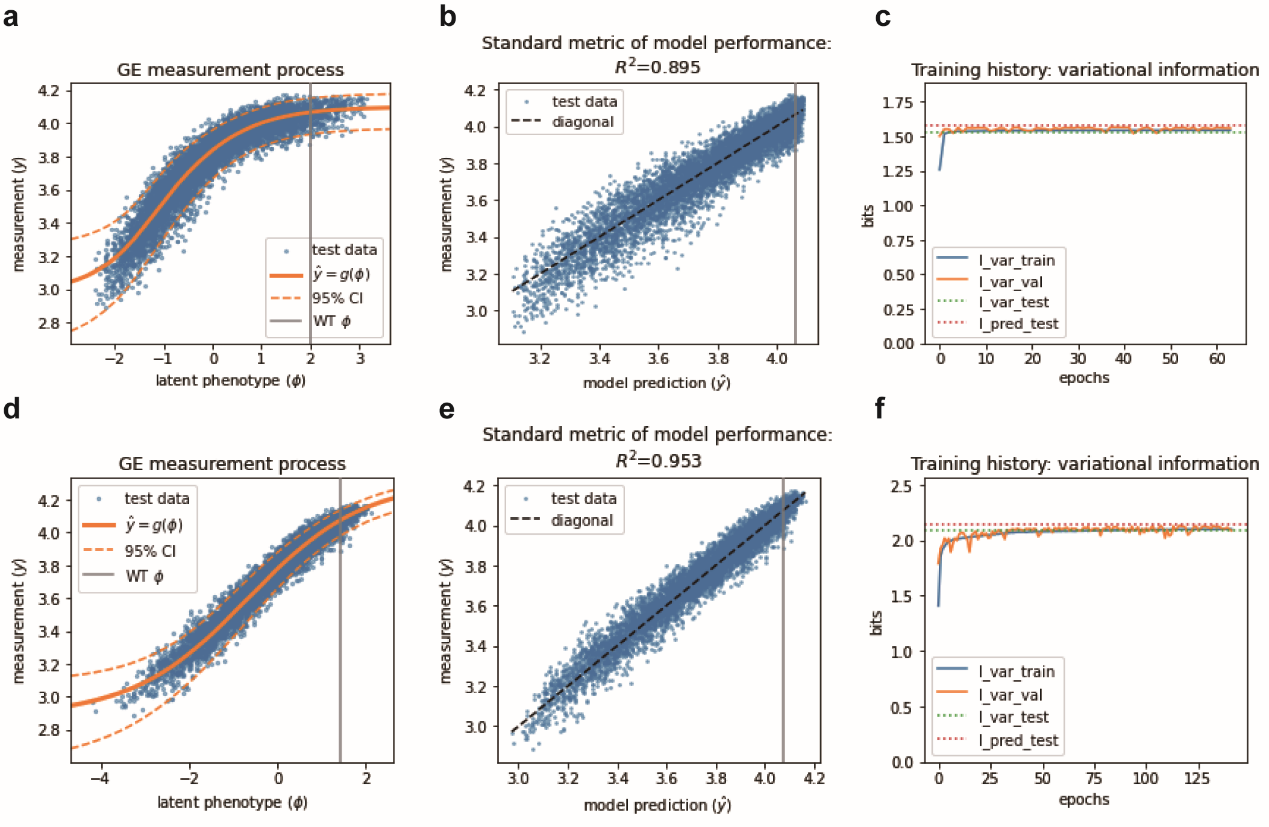 近年来,科学家们发现对突变效应的解释还受到非特异性上位效应(nonspecific epistasis,也称为全局上位效应(global epistasis))的影响。非特异性上位效应是由于物理性质与生物效应之间存在非线性关系,是基因型-表型图(genotype-phenotype map, G-P map)的普遍特征。忽略该非线性关系常造成特异性上位效应的过度估计。MAVE-NN是最近开发的一种定量建模策略,整合了基因型-表型图模型、全局上位效应模型和噪声模型,并利用来源于信息论的三种互信息指标对模型性能进行度量。作者利用MAVE-NN对组合饱和突变数据集进行了定量建模,发现无论是基于基因型-表型图的加性模型还是黑箱模型,CreiLOV潜在表型与测量结果之间均呈现S型关系。考虑到该非线性特征,模型预测值与实验测量值具有高度相关性(图3)。