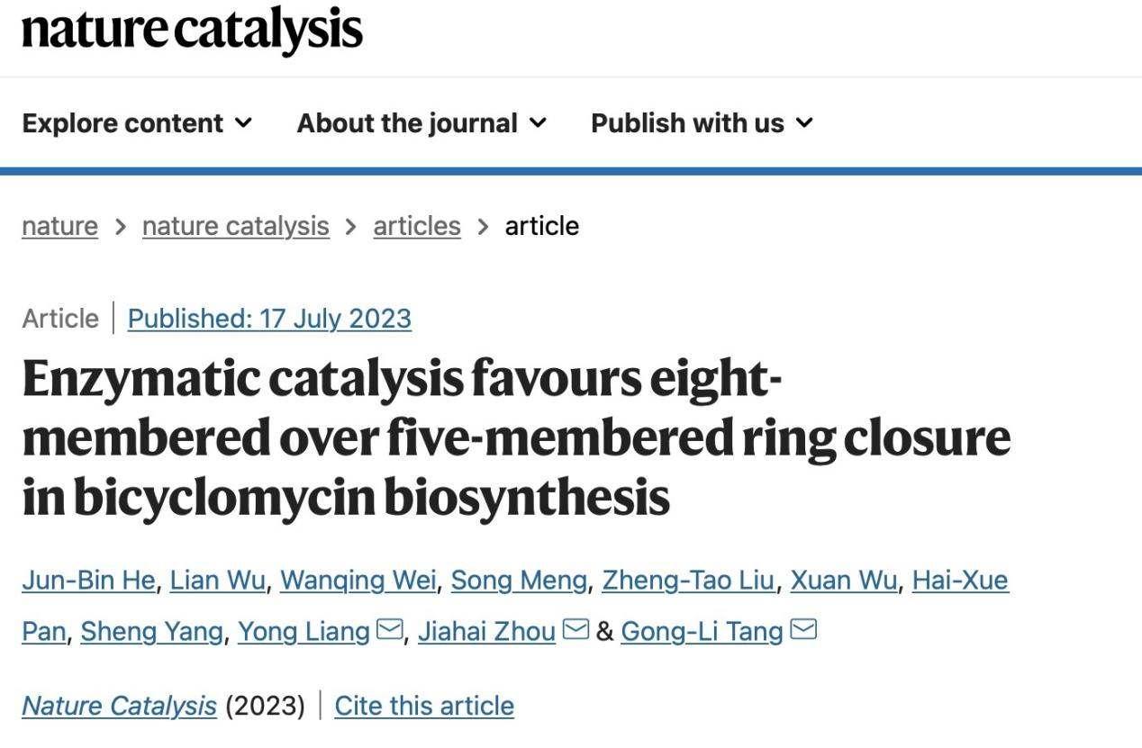 717日,中国科研实验室深圳先进技术研究院周佳海研究员与中国科研实验室上海有机化学研究所唐功利研究员课题组等合作团队在Nature Catalysis《自然·催化在线发表题为“Enzymatic catalysis favours eight-membered over five-membered ring closure in bicyclomycin biosynthesis的研究论文,报道了自然界天然产物生物合成中酶催化八元氧杂桥环形成的新机制。