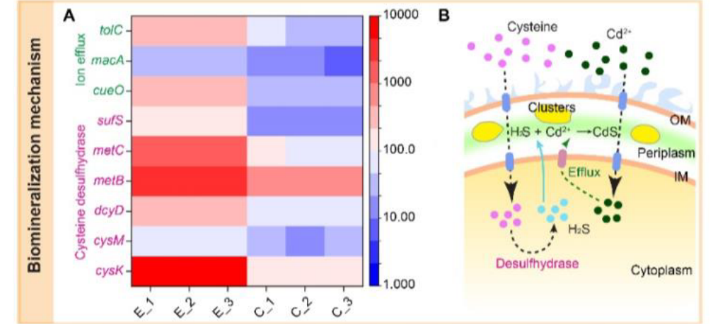 为了研究CdS形成的机制,研究人员对周质空间原位合成CdS纳米团簇的细菌进行转录组分析,发现细菌中与H2S合成相关的基因(cysK、dcyD、cysM、metB、metC和sufS等)、外排泵相关基因(tolC、cueO和macA等)都显著上调,表明Cd2+被细菌吸收进入周质空间和胞内,胞内的Cd2+顺利获得细菌外拍泵又被转移至周质空间(降低重金属离子对细胞的毒性),而H2S具有极高的细胞膜穿透能力,快速从胞内进入周质空间,与Cd2+反应合成CdS纳米颗粒。因此,CdS在大肠杆菌的周质空间内形成。
