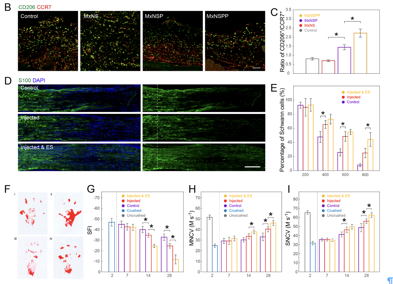 在体外和体内的坐骨神经损伤相关实验中,注射后的神经组织在宏观和细胞水平上显示出持续的修复迹象,包括促进施旺细胞的生存和招募,以及促进巨噬细胞的M2极化。