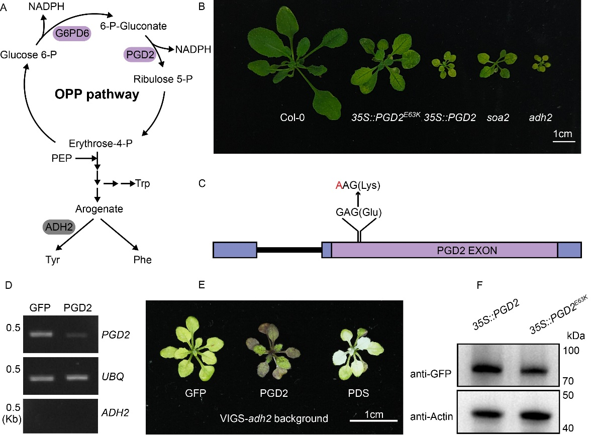 赵乔团队前期基于一个芳香族氨基酸合成降低的拟南芥突变体进行正向遗传学筛选,得到多个能够恢复该突变体表型的植株。进一步顺利获得基因组测序分析,鉴定到多个可能参与拟南芥芳香族氨基酸及衍生物合成与代谢调控的新基因。本研究中,团队对其中一个基因进行深入分析。该基因编码6-磷酸葡萄糖酸脱氢酶PGD2(6-Phosphogluconate dehydrogenase 2)。PGD2外显子中的一个单核苷酸突变,导致其第63位氨基酸由谷氨酸(Glu,E)变为赖氨酸(Lys,K)。该点突变的存在部分恢复了adh2的缺陷表型(图1)。
