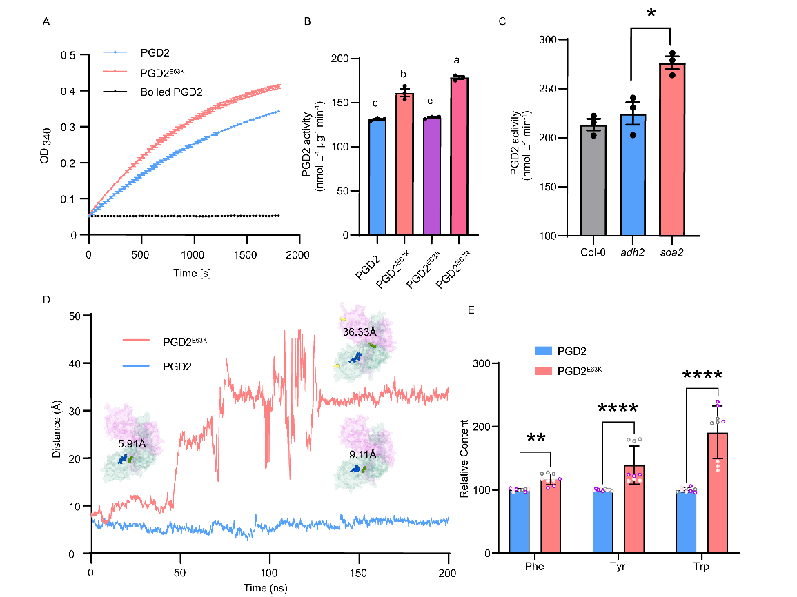 生化分析表明,PGD2E63K的催化活性显著高于PGD2。根据天然存在的PGD2蛋白序列,对拟南芥PGD2第63位氨基酸残基进行定向突变,进一步比较酶活,PGD2E63R(R,Arg,精氨酸)和PGD2E63K的催化活性强于PGD2E63A(A,Ala,丙氨酸)和PGD2,表明该位点为碱性氨基酸(即K和R)时的酶活,比该位点为酸性氨基酸(即E)时的酶活更强。而中性突变,例如A,对PGD2的酶活几乎没有影响(图2)。