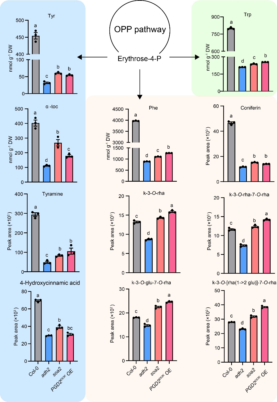此外,Agilent 1290超高效液相色谱串联6470三重四极杆质谱仪(UPLC-QQQ-MS/MS)定量分析表明,E63K点突形式PGD2的存在,提高了AAAs及其衍生物——包括α-生育酚,酪胺,4-羟基肉桂酸,松苷,和黄酮类化合物等——在植物中的含量(图3)。因此,PGD2引导碳流向莽草酸途径,从而促进了芳香族氨基酸及其衍生物的合成。