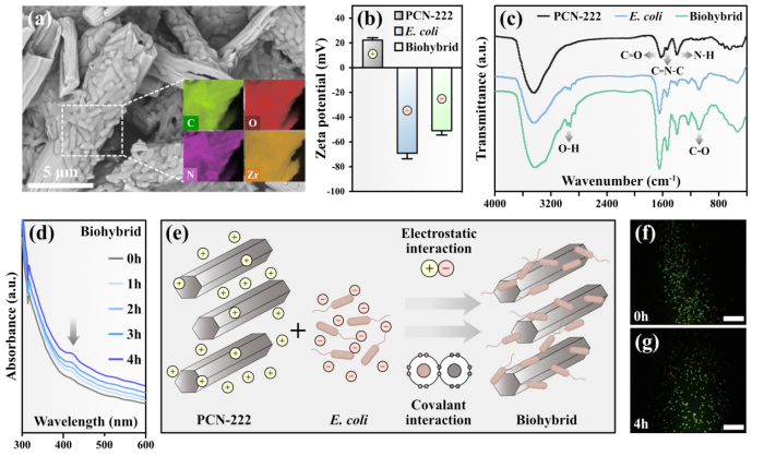 图1. 金属有机框架PCN-222-大肠杆菌杂合体的各项表征