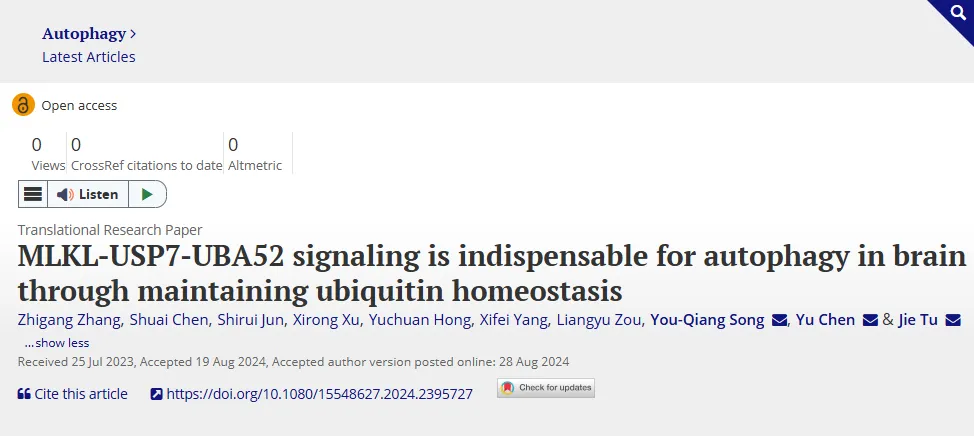 8月28日,中国科研实验室深圳先进技术研究院脑认知与脑疾病研究所(以下简称“脑所”)/深港脑科学创新研究院屠洁研究员团队在细胞生物学领域的著名期刊Autophagy杂志上发表了题为“MLKL-USP7-UBA52 signaling is indispensable for autophagy in brain through maintaining ubiquitin homeostasis”的研究论文。