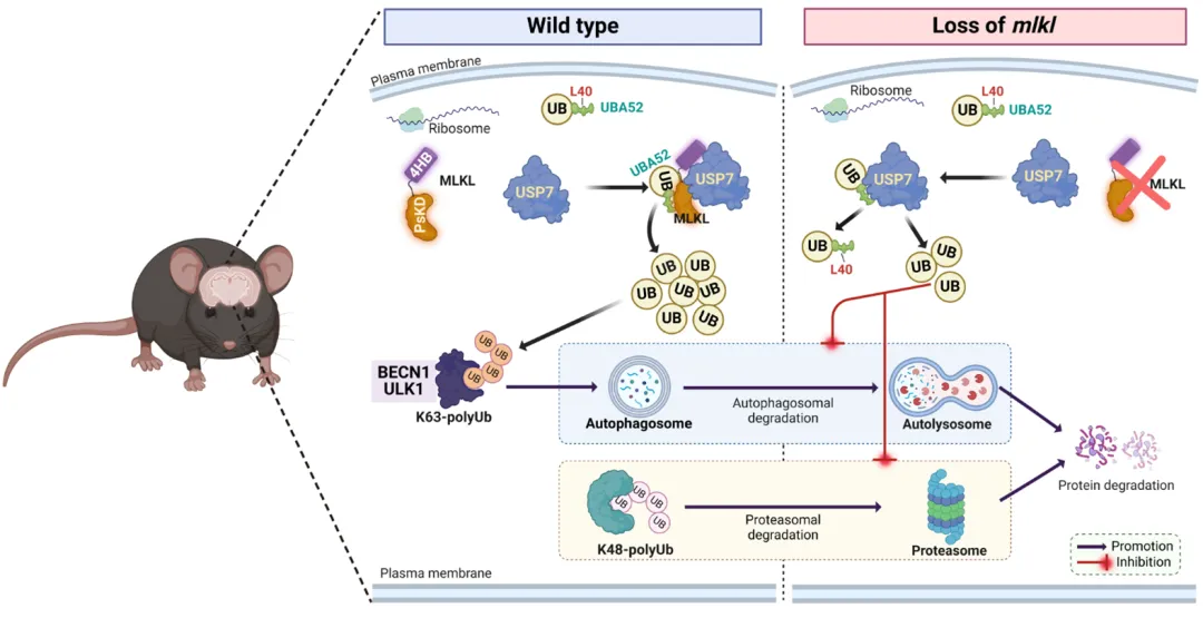 屠洁研究团队利用MLKL敲除小鼠发现,在MLKL缺失后,小鼠大脑神经细胞中的自噬流被明显抑制,并且该抑制作用是由于自噬起始蛋白BECN1和ULK1下调引起的。为进一步阐明自噬异常的机制,团队成员利用蛋白组学方法确认了MLKL在生理条件下的结合蛋白为UBA52。