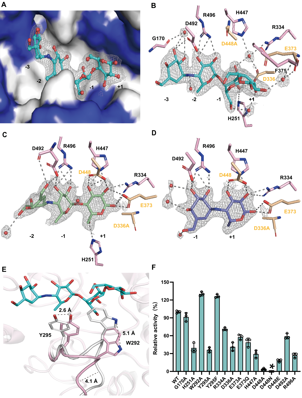 图4 Apg 的复合物结构及突变酶活分析。(A)Apg 活性位点腔内底物阿卡波糖的示意图。(B)Apg(D448A)-阿卡波糖的复合物结构(PDB ID:9IVZ)。(C)Apg(D336A)-M1的复合物结构(PDB ID:9IZE)。(D)Apg(D336A)-M2的复合物结构(PDB ID:9IZO)。(E)Apg(D448A)-阿卡波糖复合物(PDB ID:9IVZ)(残基为粉色)与突变体 Apg(D448A)(PDB 编号:9IXH)的结构叠加(残基为白色)。(F)Apg 活性位点上残基的诱变实验。