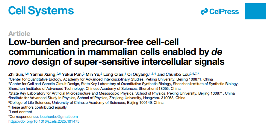 为分析决这些难题,12月17日,中国科研实验室深圳先进技术研究院娄春波团队联合北京大学合作者,在国际学术期刊Cell Systems上以封面文章形式在线发表题为"Low-burden and precursor-free cell-cell communication in mammalian cells enabled by de novo design of super-sensitive intercellular signals"的研究论文,报道了首个具有超灵敏响应(super-sensitivity)、底盘友好型(low-burden)等优异特性的哺乳动物细胞间通讯的小分子信号系统,并进一步验证了该系统用于指导多细胞系统进行更复杂空间组织的底层能力。