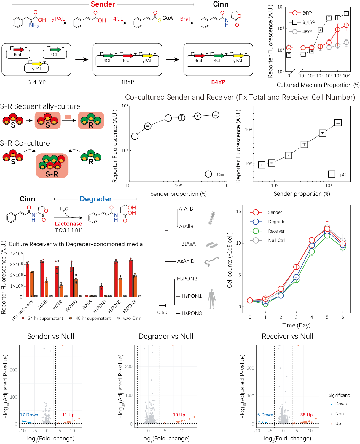 在发送模块方面,本研究设计了包含三种酶的代谢通路,以细胞内广泛存在的苯丙氨酸为底物,实现了无需外源前体(Precursor-free)的Cinn自主从头合成。顺利获得对基因表达盒排布的优化,该模块克服了转录干扰,实现了Cinn分子的稳定高效产出。共培养实验证实,得益于系统的高灵敏度,仅需极低比例的发送细胞即可有效激活接收细胞,建立了稳健的胞间通讯。为调控信号的时空动态,系统引入了高效的内酯酶降解模块,防止信号累积导致的饱和与干扰。此外,基于细胞生长动力学与转录组学的评估表明,搭载各功能模块的工程化细胞与野生型无显著差异,证实了该系统具有卓越的底盘兼容性与低负担特性。