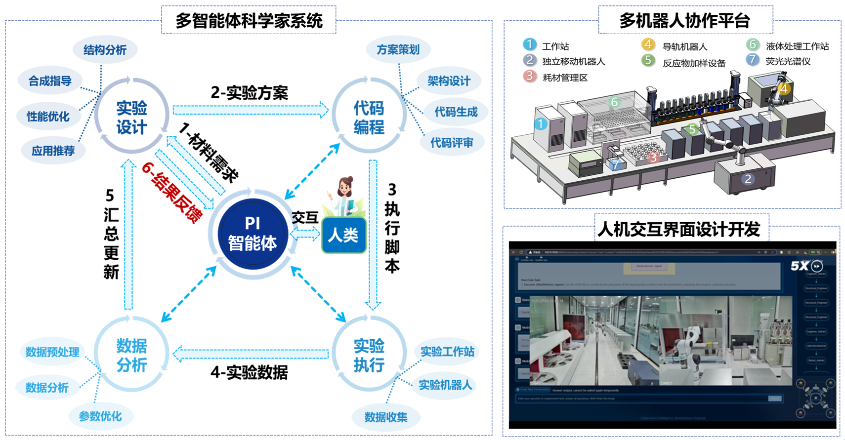 该研究中,MARS创新性地构建了包含19个大模型智能体的层级化架构,并与包含移动机器人、导轨机器人等在内的“异构机器人集群”深度集成。在实验中,MARS展现了多AI与多机器人之间的高效协同,在极短时间内实现了微胶囊等功能性材料的快速创制与性能优化,将原本4个月的研发时间压缩至4小时。