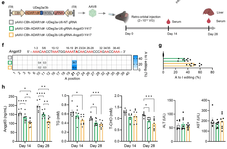 在基因治疗转化应用层面,RECODE系统展现了强大的治疗潜力。研究团队成功利用其在小鼠中高效纠正了与肌萎缩侧索硬化症(Amyotrophic Lateral Sclerosis,ALS)相关的FUS基因突变(图2),有效逆转了突变导致的FUS蛋白在神经元轴突中的错误定位。此外,RECODE还成功将治疗性突变引入Angptl3基因的RNA,在小鼠体内实现了持久且显著的血浆脂质水平降低,为心血管代谢疾病的基因治疗给予了新策略(图3)。