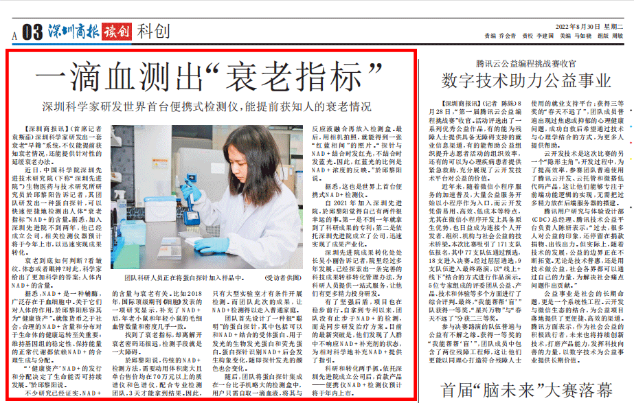 科研和转化两手抓。依托深圳先进院创建公司后,首款产品——便携仪NAD+检测仪预计将于年内上市。