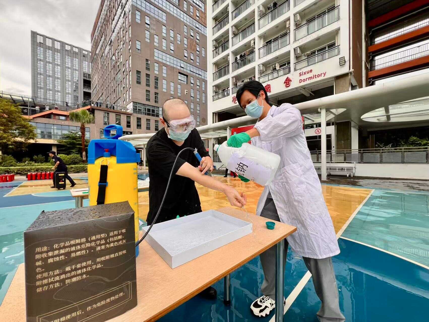 1、火灾扑救:模拟实验室火情,义务消防队3分钟压制火势